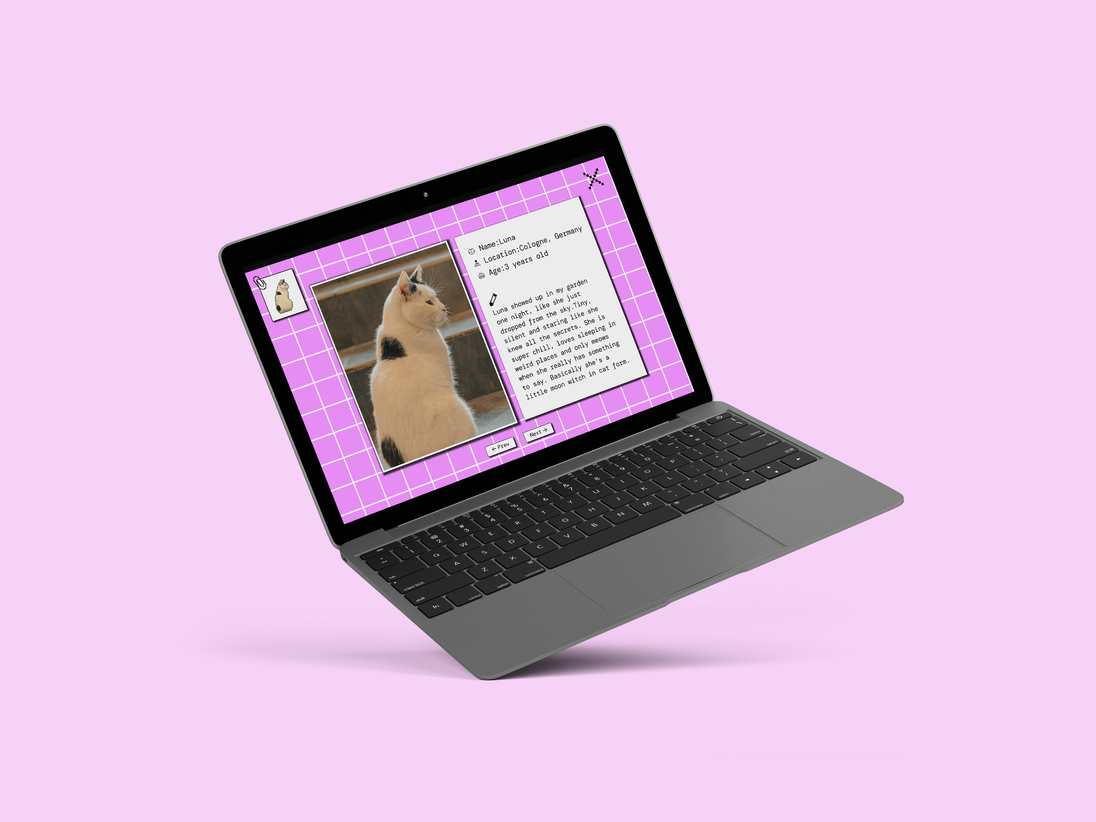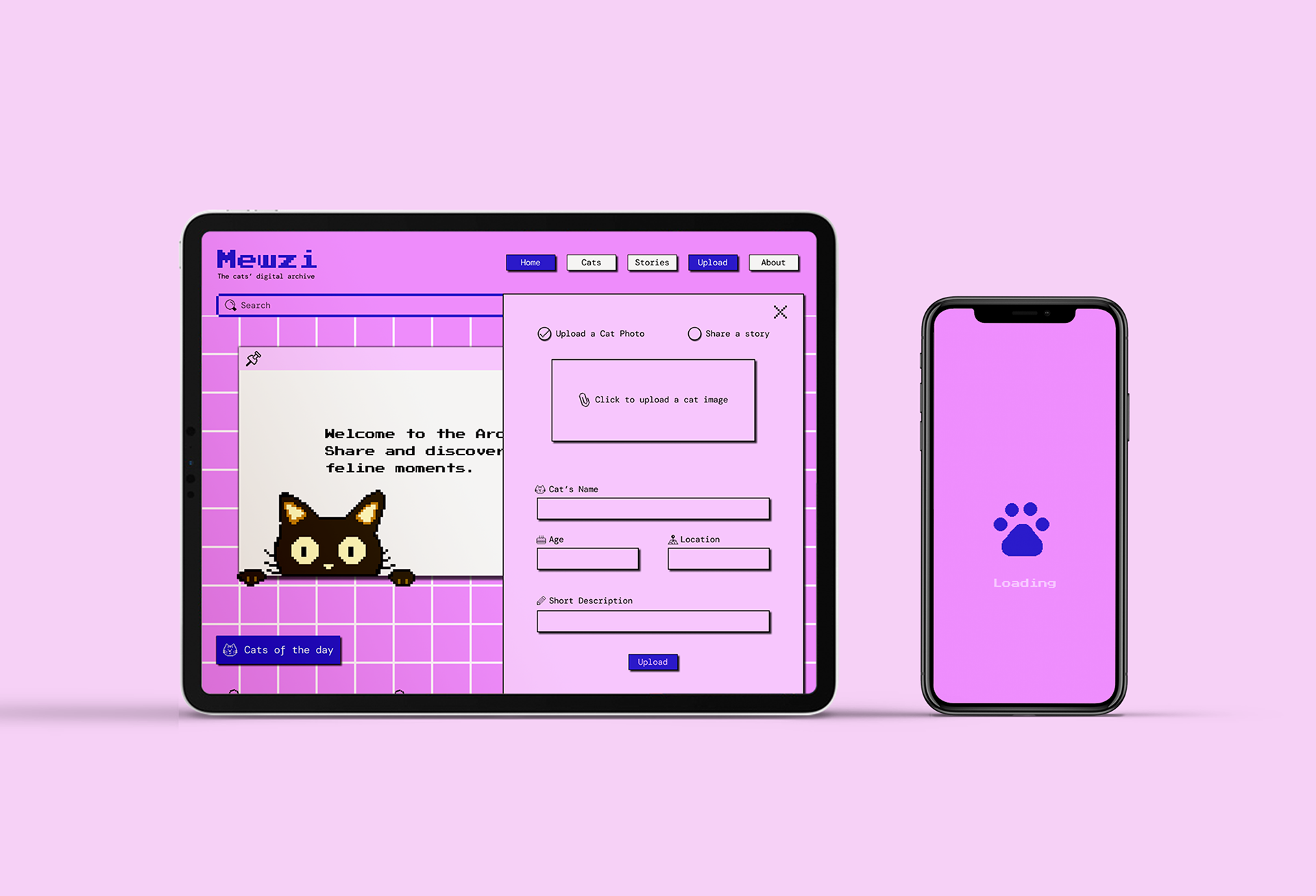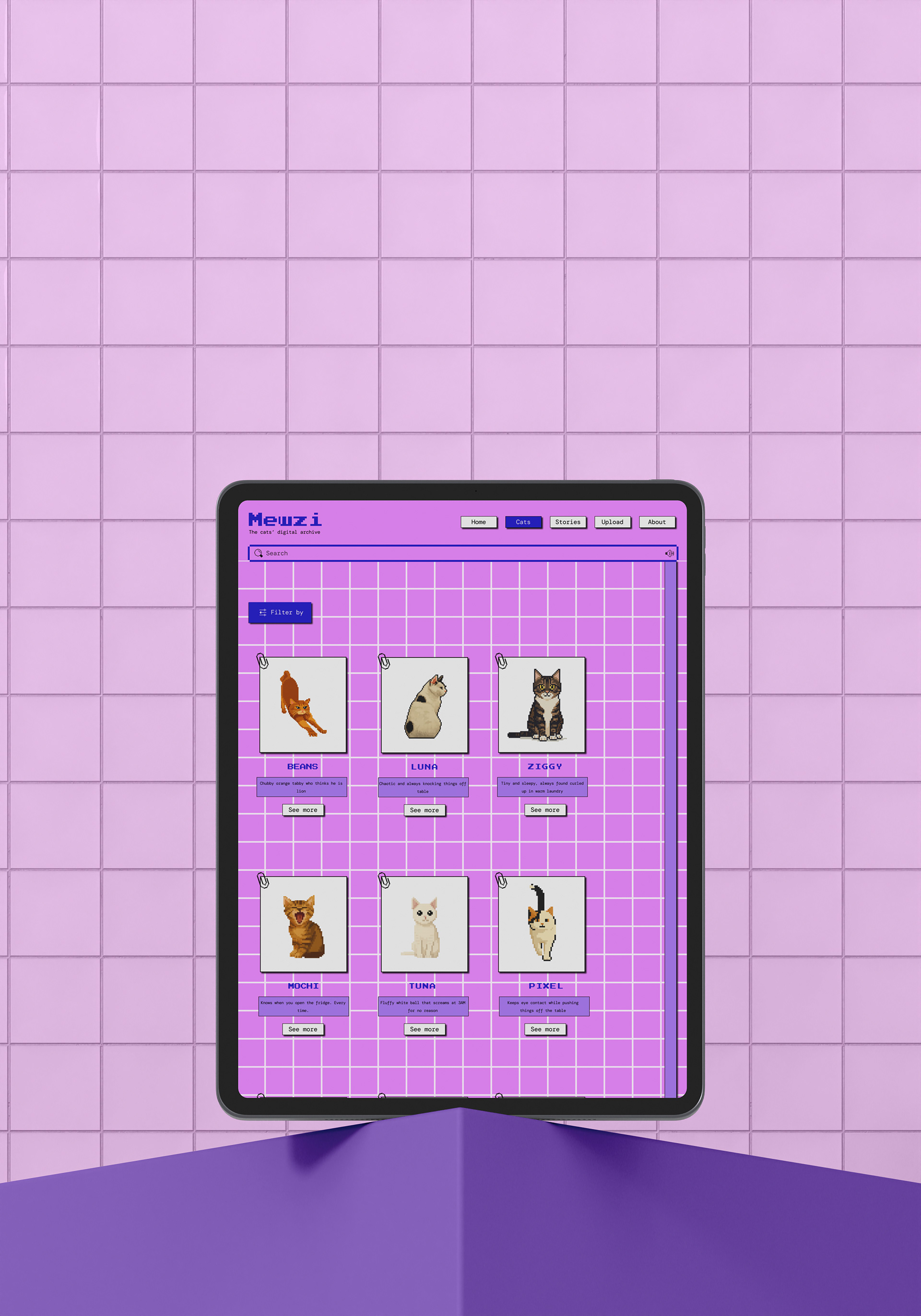 Mewzi Archive is the second approach to creating a cat archive. I designed the website with an old-school web aesthetic, combining playful visuals with interactive features. Each uploaded photo is transformed into pixel art . Clicking on it reveals the full image and story behind it. The site also includes a “Stories” section where cats come to life through short stories. With its mix of nostalgia, interactivity, and community input, Mewzi Archive offers a quirky and engaging way to explore the world of cats online.