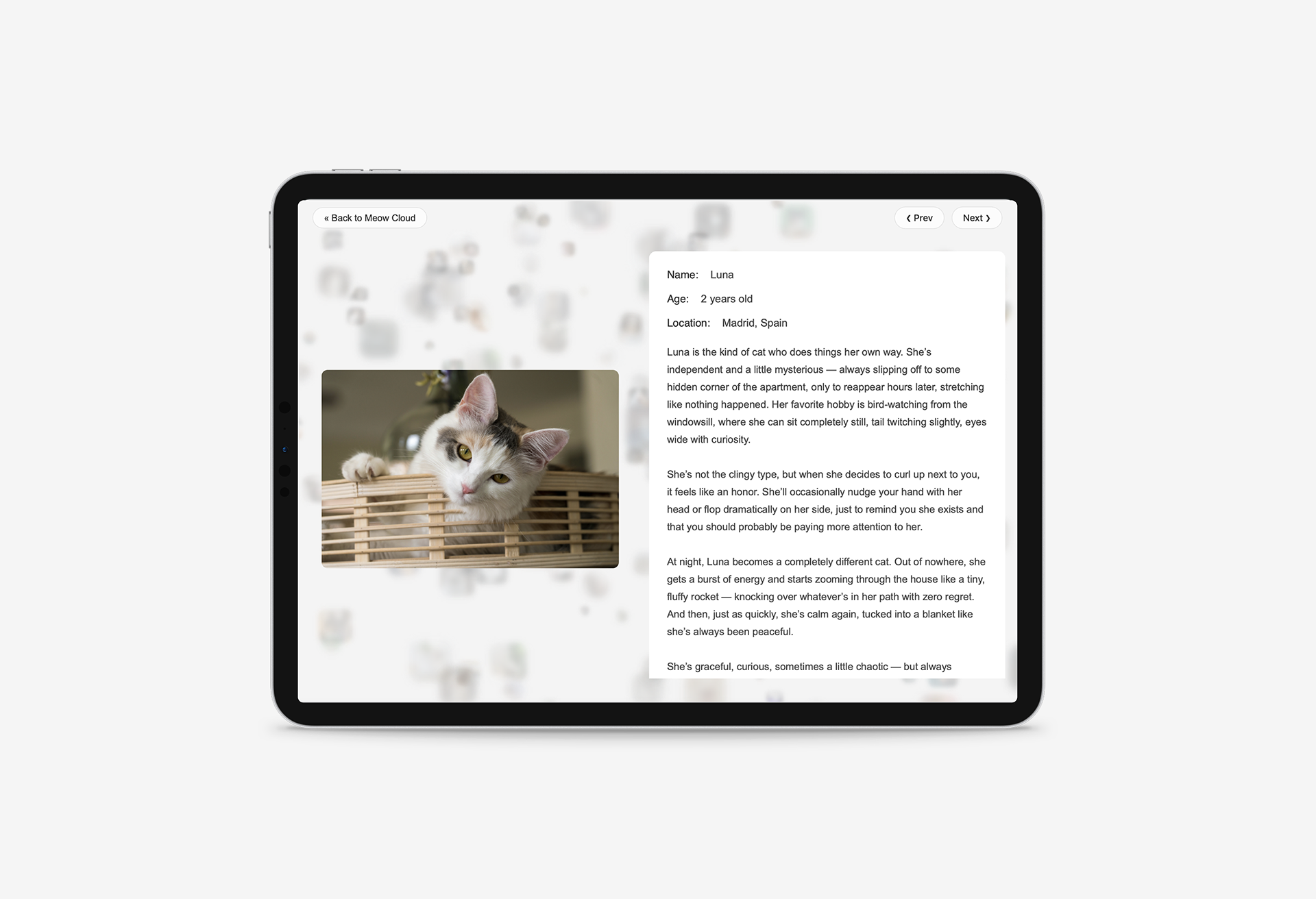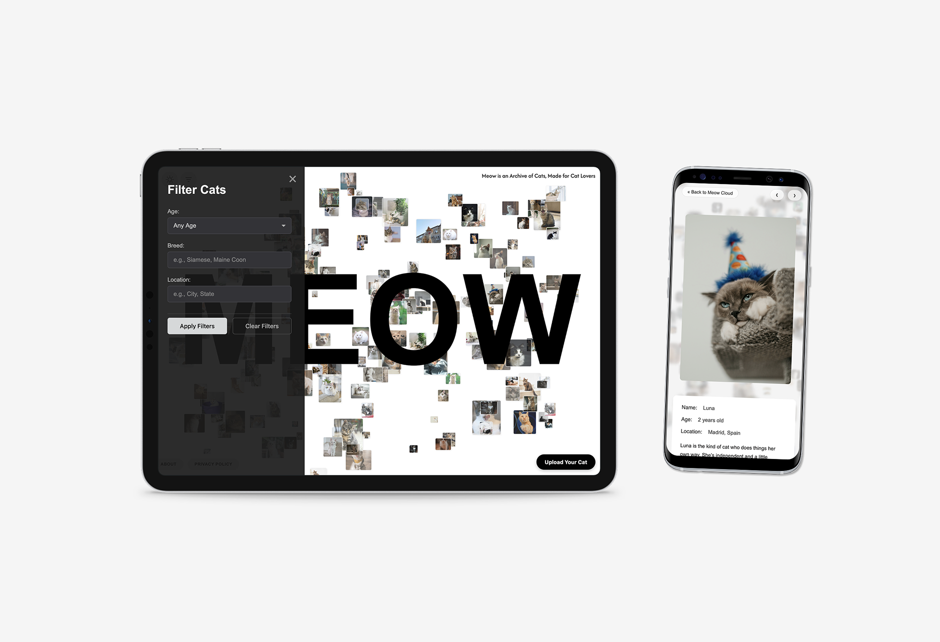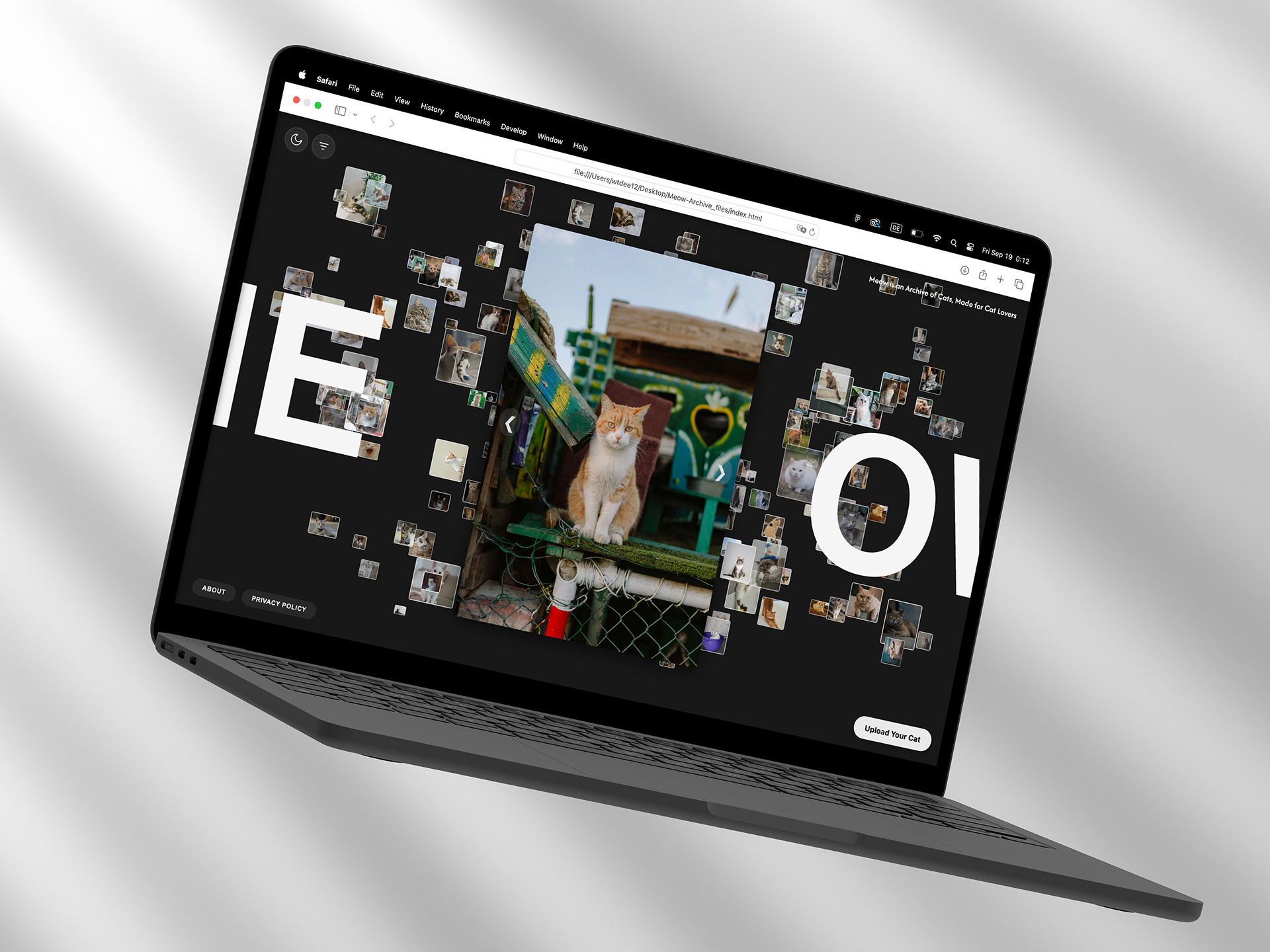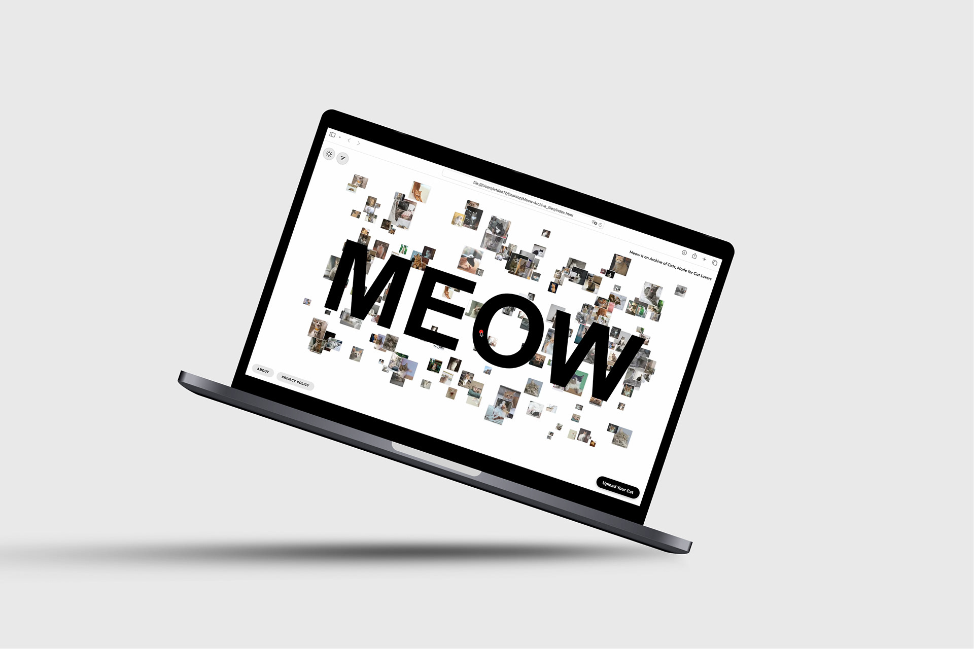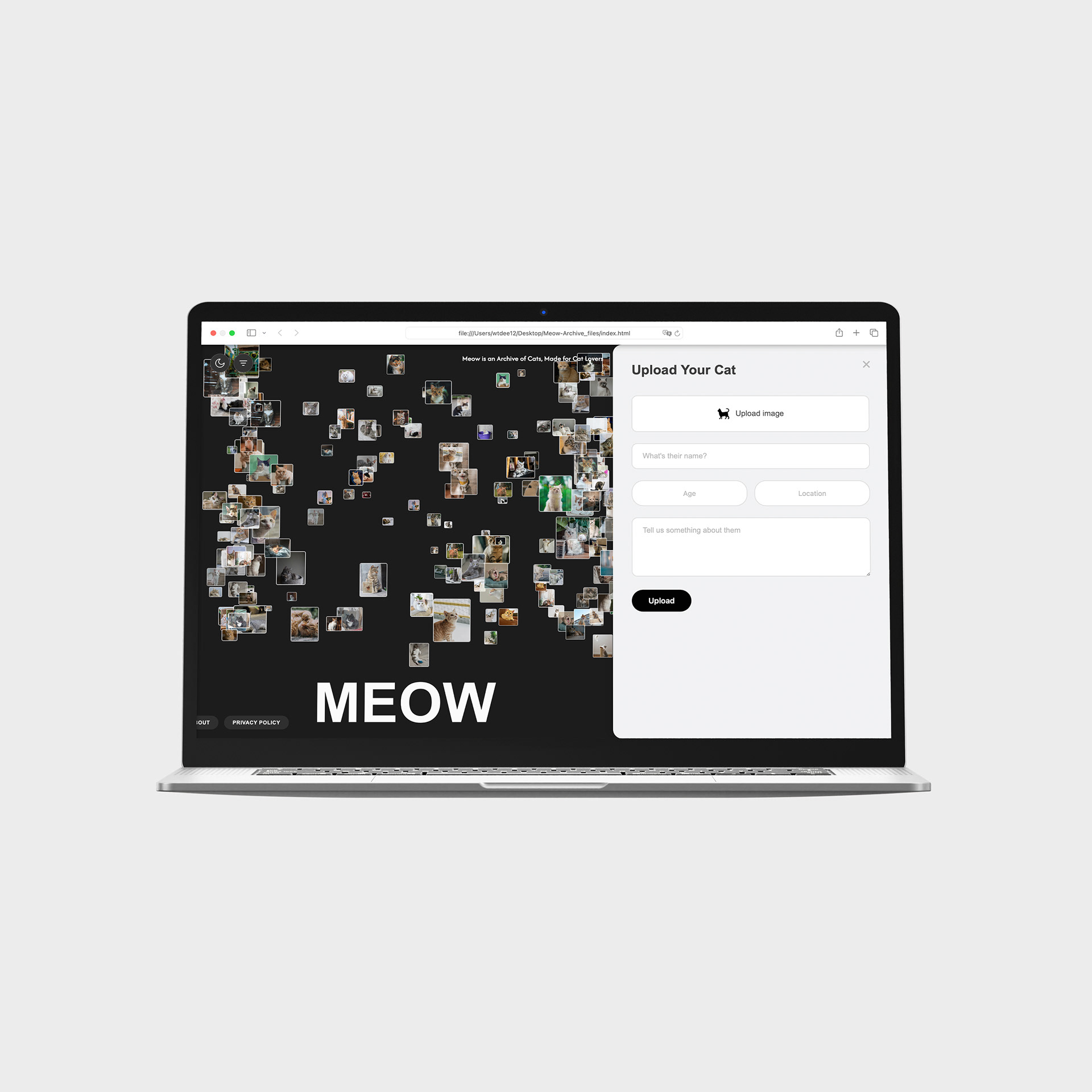 Meow Archive is my first approach to creating a digital cat archive. I designed and programmed the website to be both playful and functional, welcoming visitors with a floating cloud of cat images that gently drift across the screen. Each photo can be clicked to reveal stories and details, while a simple upload system allows anyone to contribute their own. With light and dark themes, soft animations, and an ever-growing collection, the archive feels alive, personal, and open to everyone.