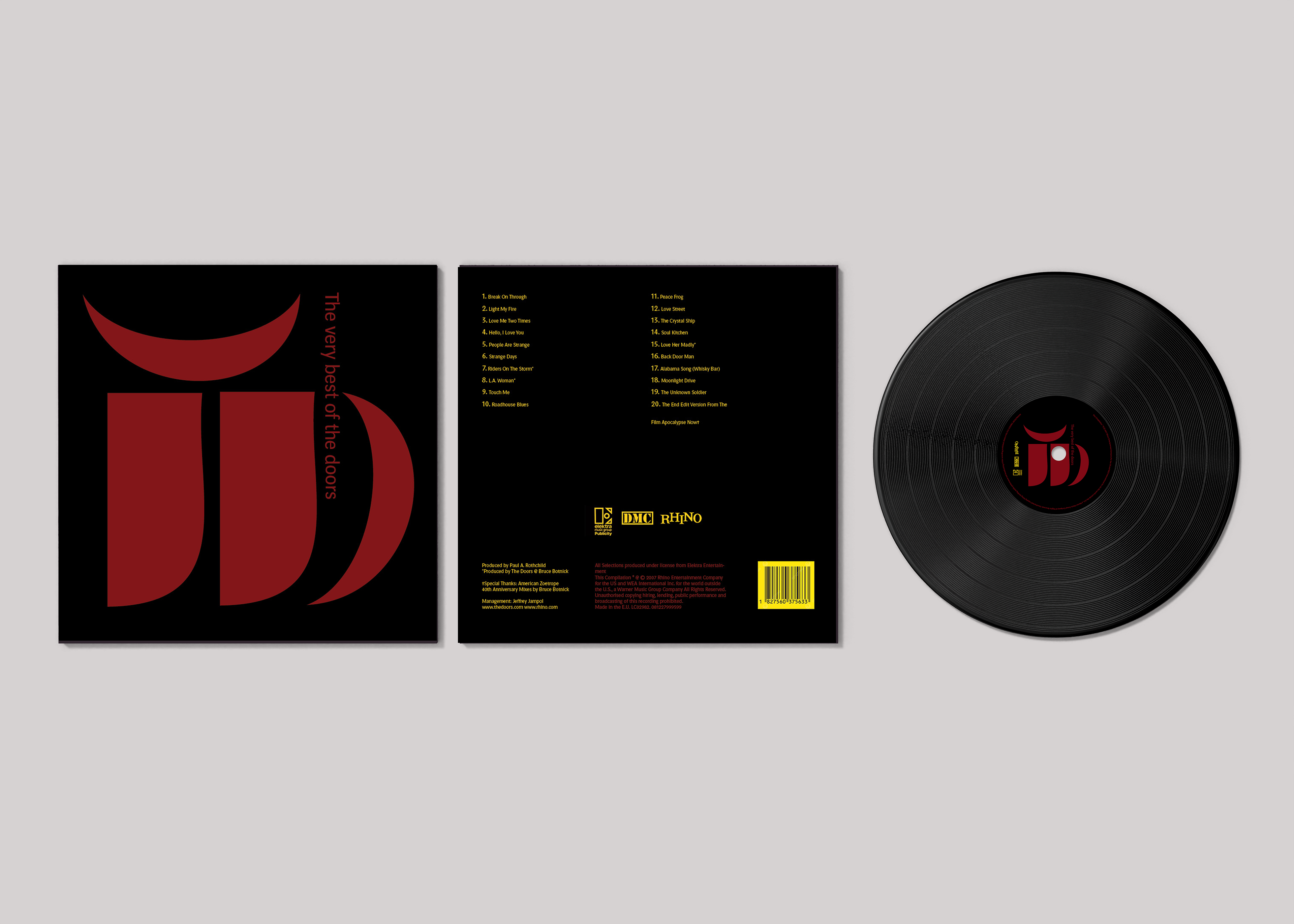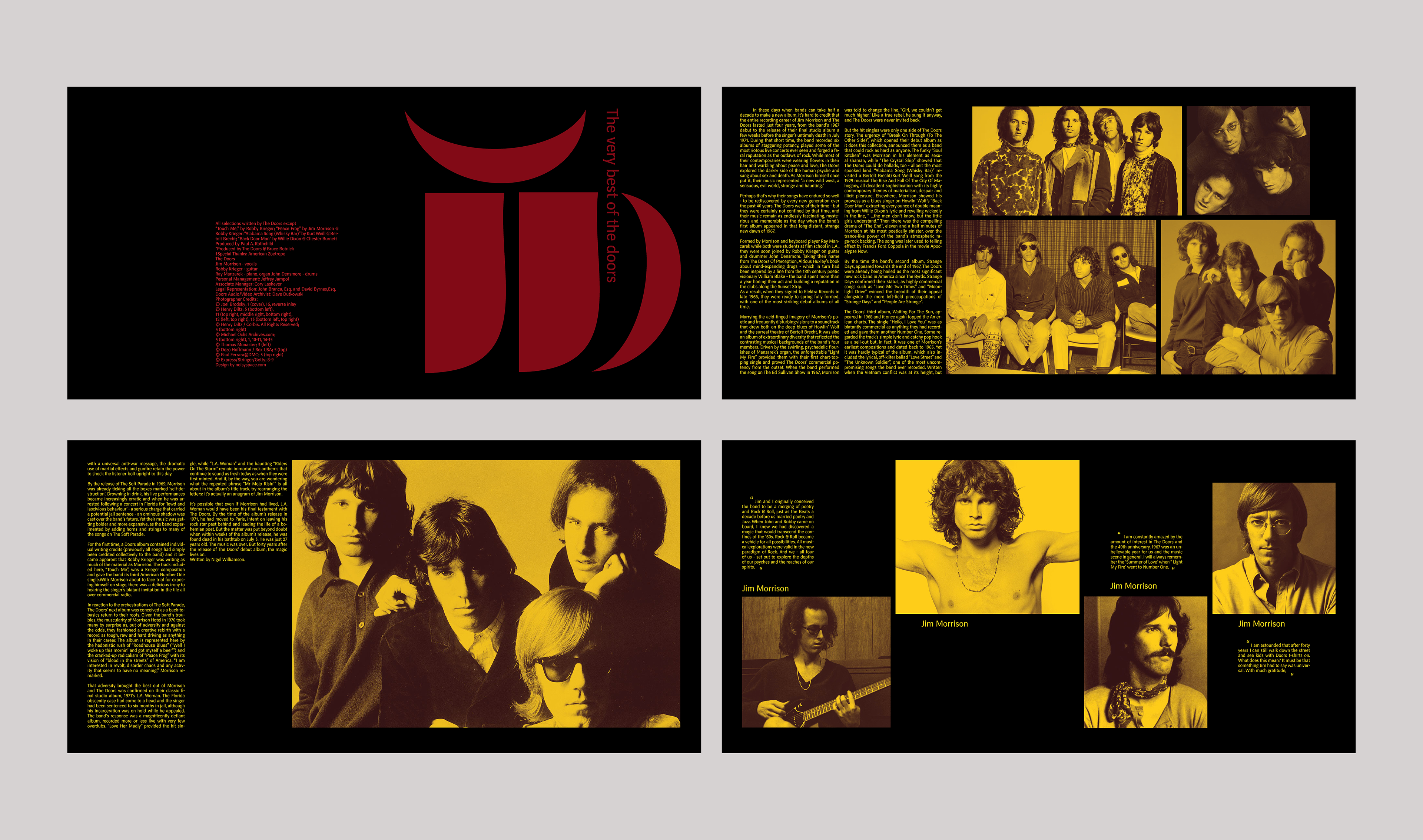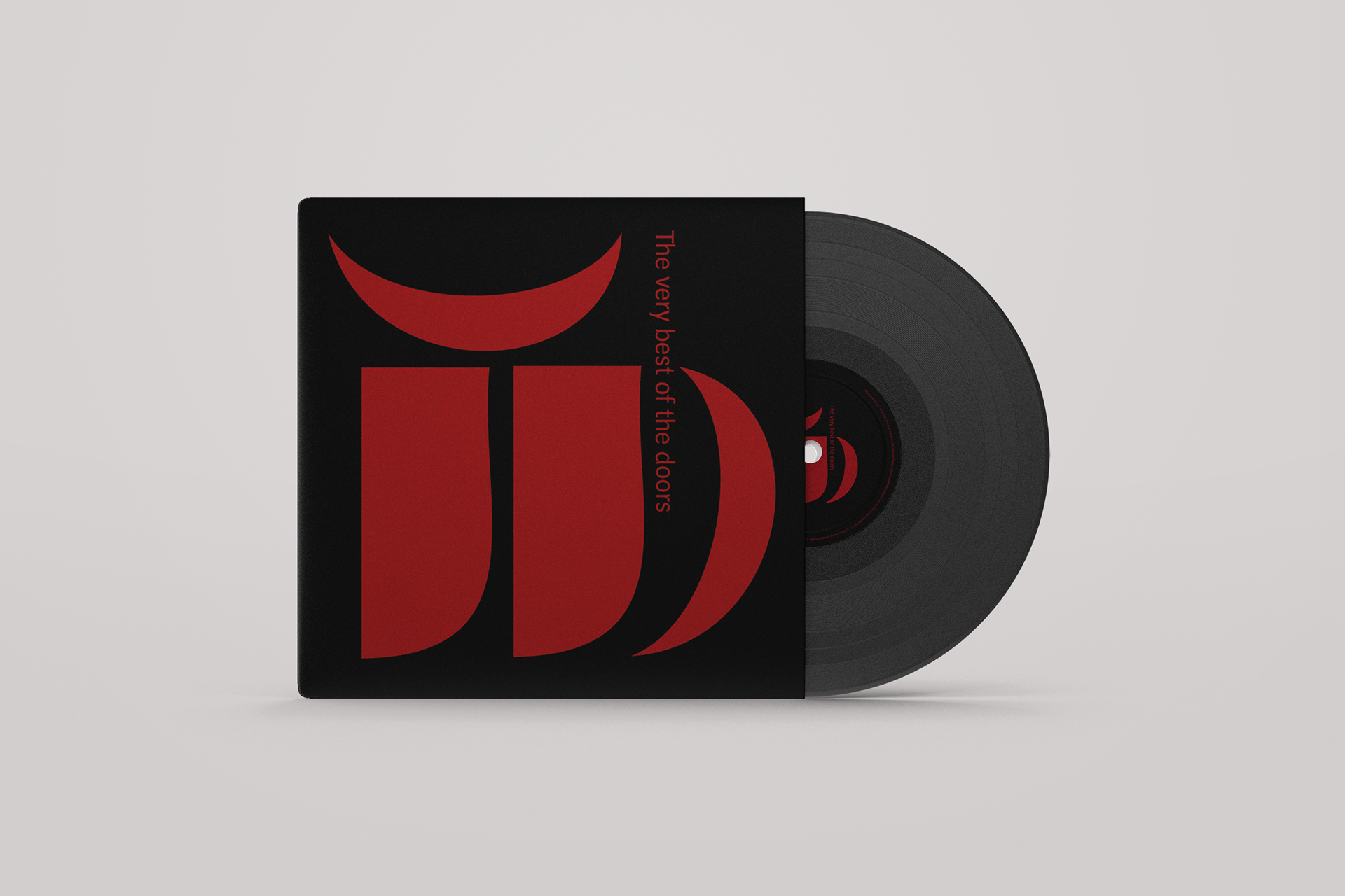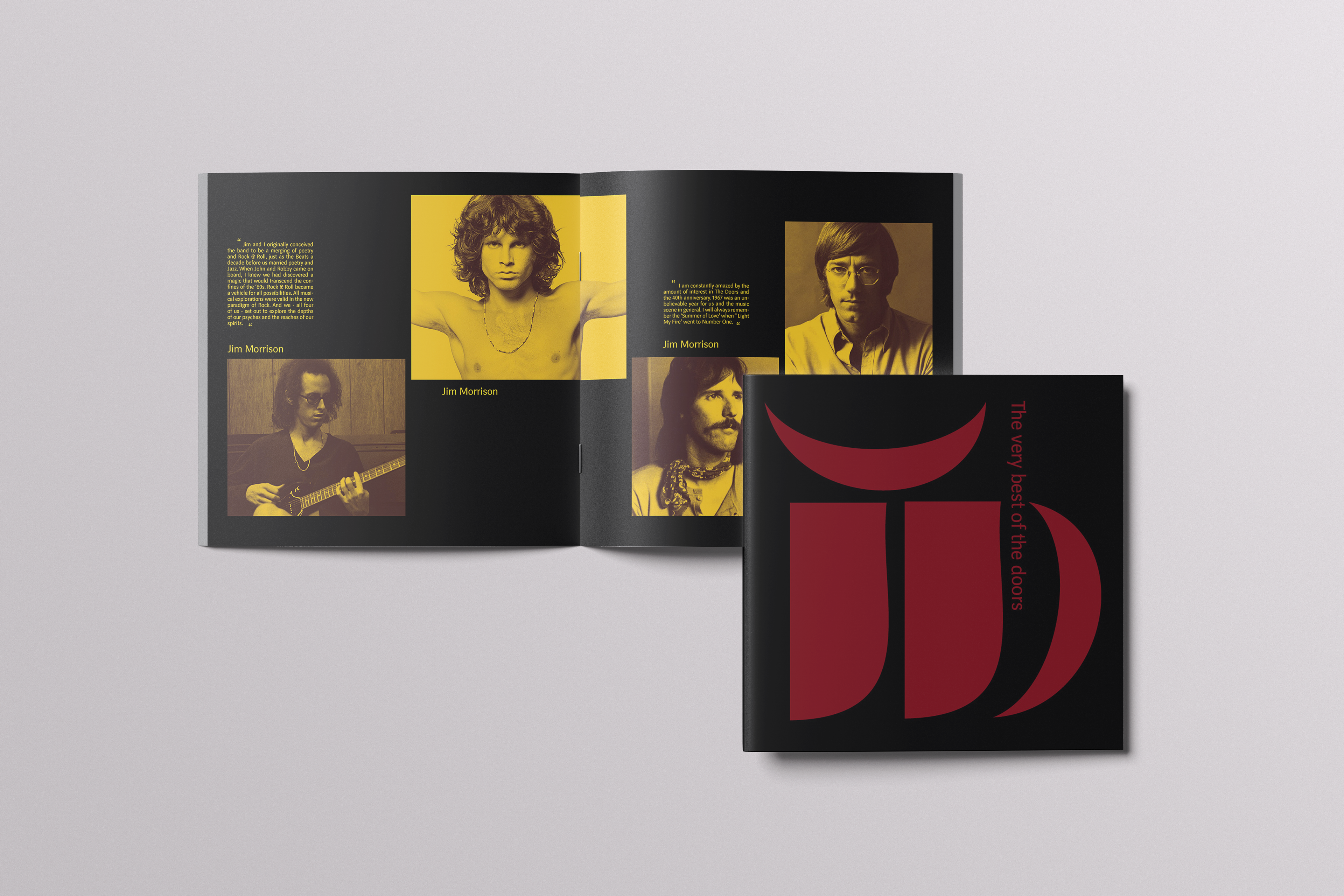 I chose The Doors and designed a new visual identity using the initials T and D as the main element. The cover features the large logo in a simple but striking composition. Alongside the CD, I created a booklet that continues the visual style. The color palette of black, red, and yellow gives the design a strong, energetic look inspired by the band’s intensity.
